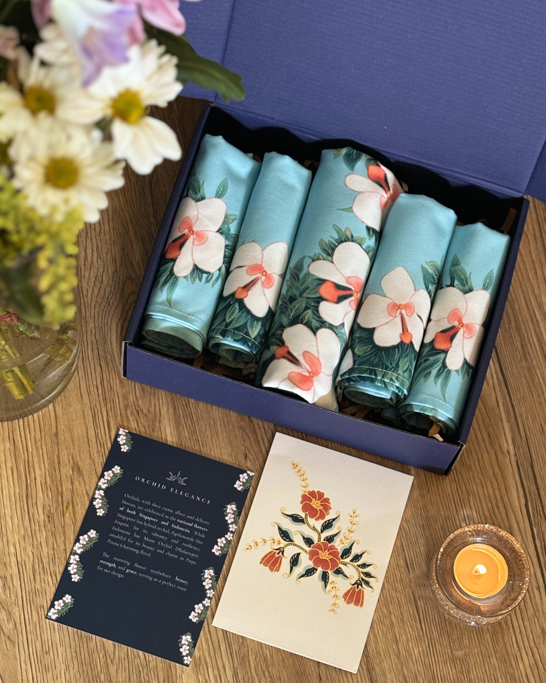 Artfully inspired by orchids, this set of four placemats and table runner brings a touch of tropical grace to any table. A thoughtful gift that blends beauty with purpose.