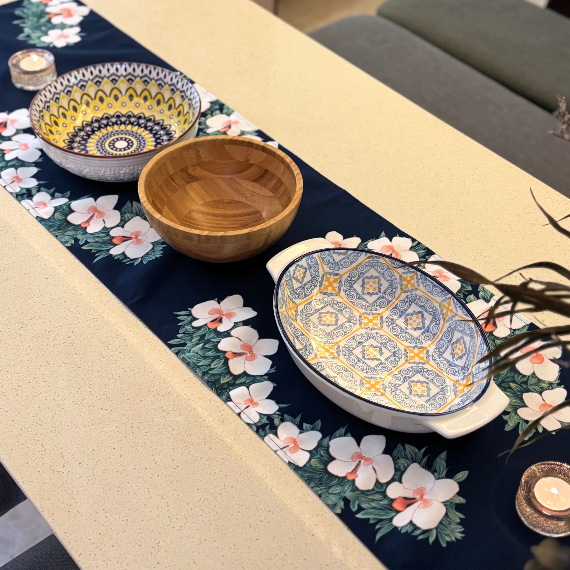 I received the navy table runner as a gift, and I couldn’t be happier with it. The deep navy tone with paired with the contrast white of the floral pattern is both calming and elegant.